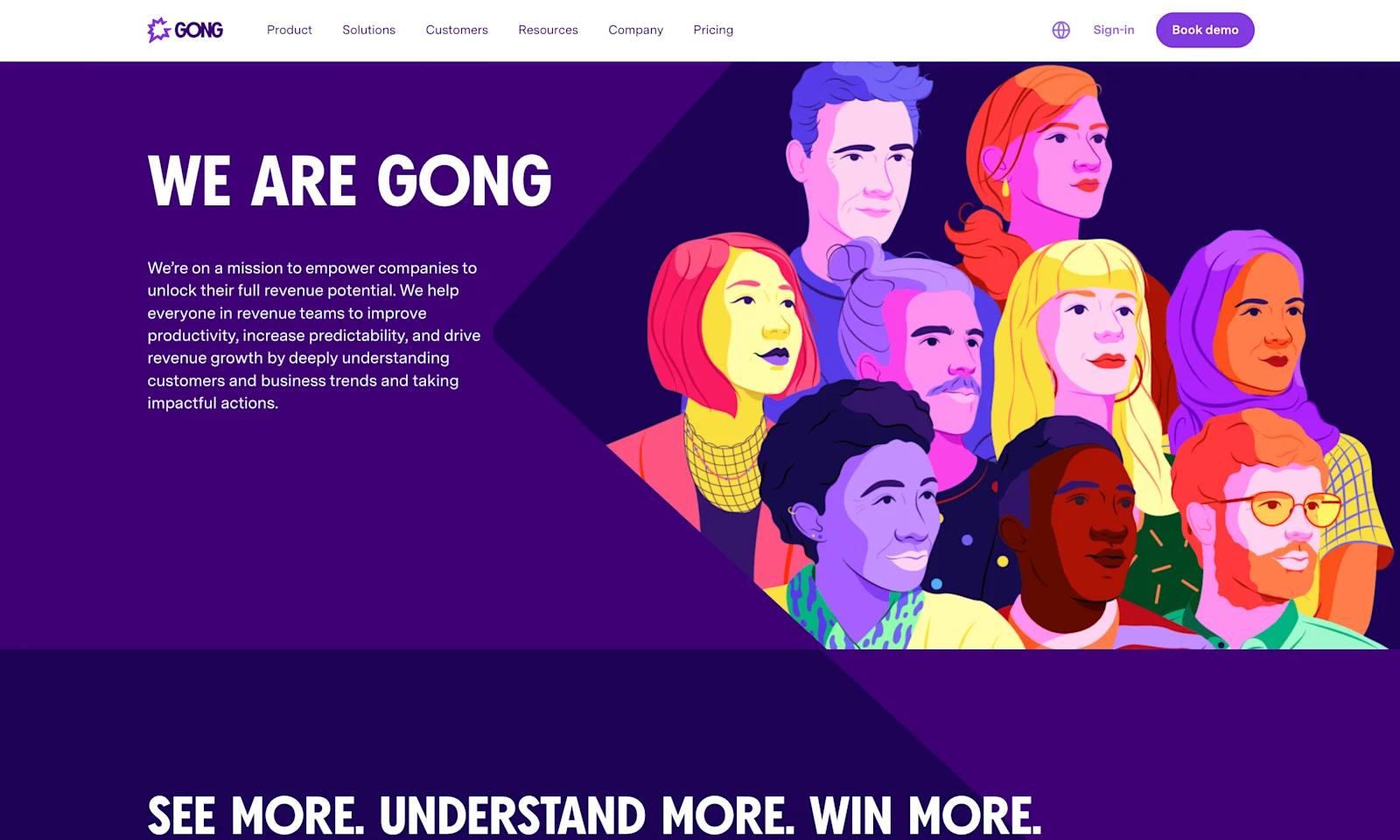 Gong's "About Us" page delivers a vibrant and bold experience that emphasizes the company's mission to help businesses see and understand more through their data-driven platform. The top section features colorful, artistic visuals of diverse individuals, reinforcing the brand's lively and forward-thinking identity.