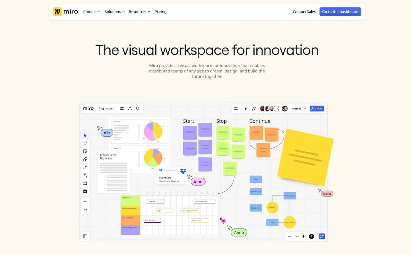 - 🛠 Product showcase: A vivid snapshot of the Miro platform immediately communicates the product’s purpose and capabilities.