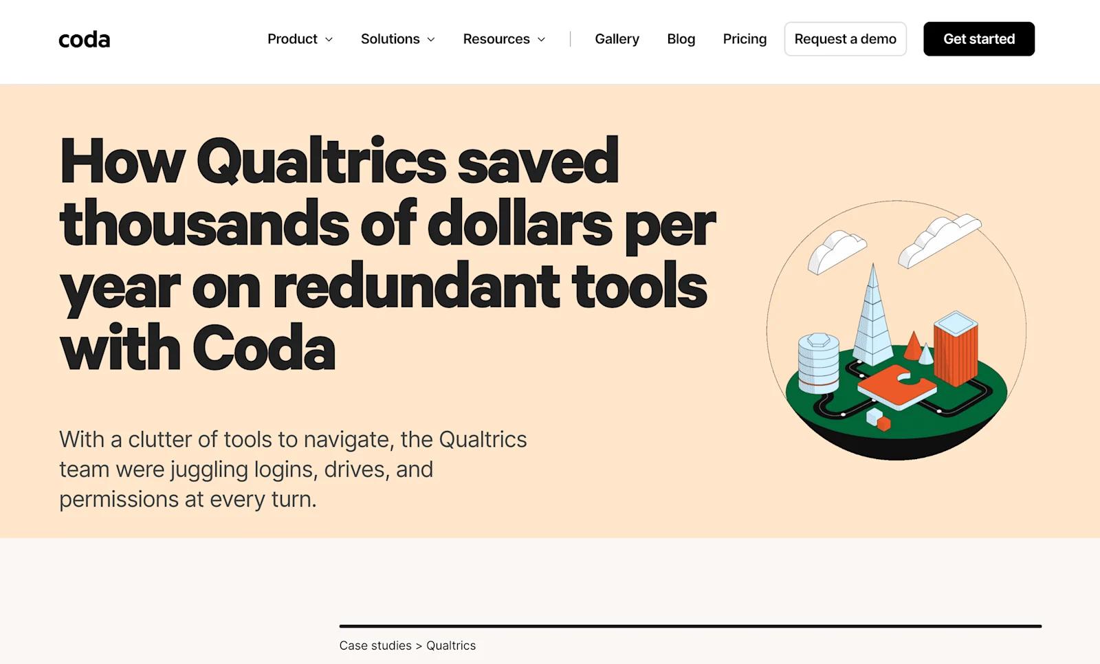 Coda’s case study with Qualtrics showcases how the research company saved thousands of dollars annually by consolidating redundant tools into a single source of truth using Coda.