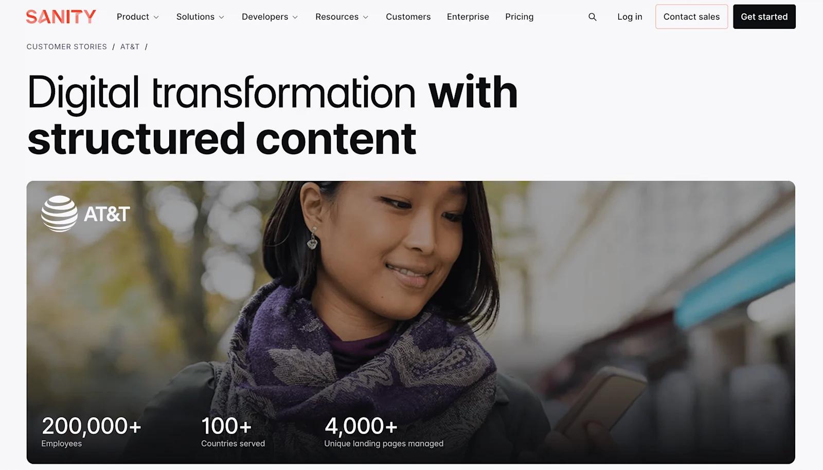 Sanity’s case study with AT&T showcases digital transformation through structured content, using a sleek, editorial-style layout.