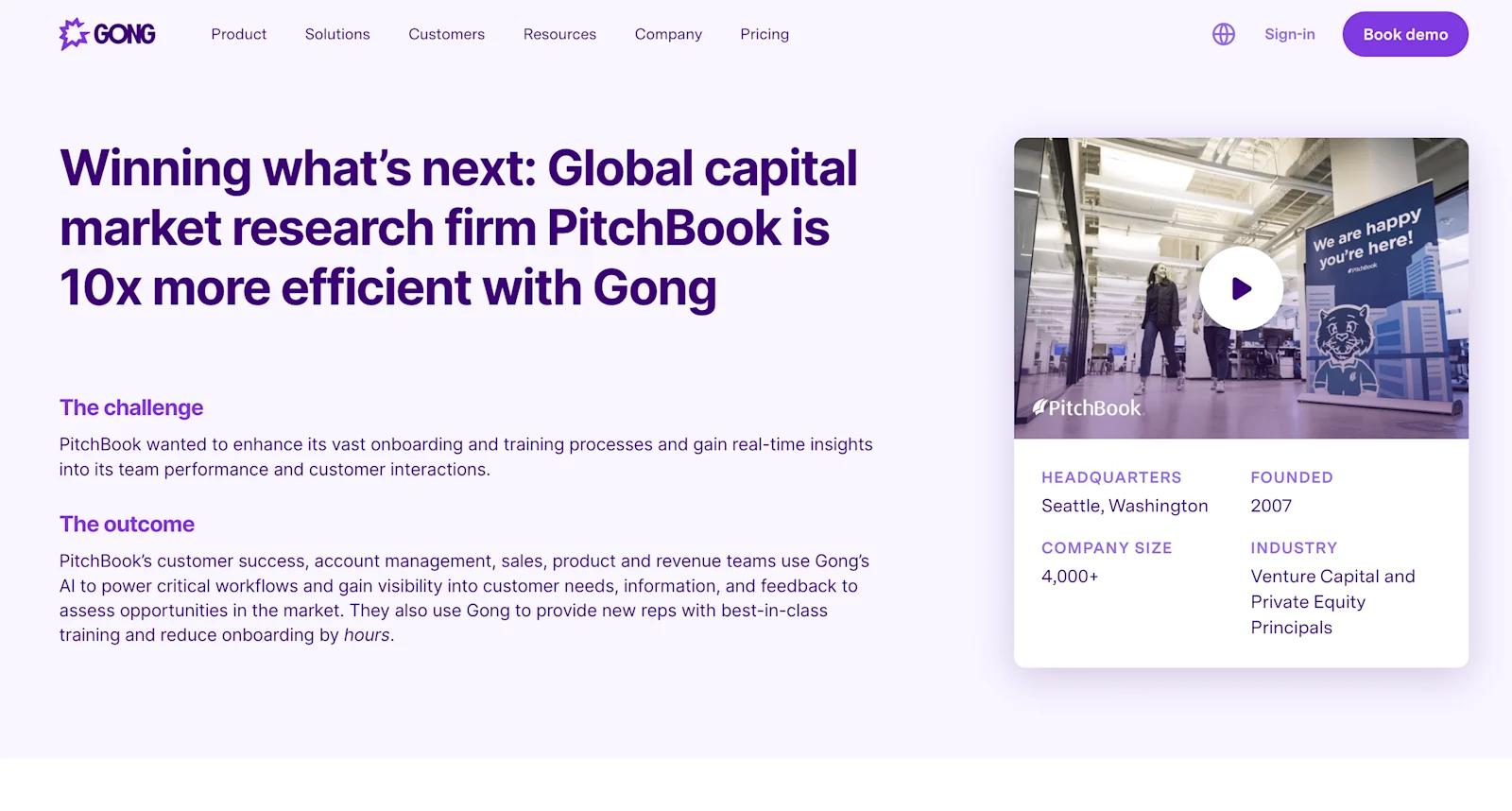 Gong’s case study with PitchBook presents a sleek, data-rich success story about how Gong’s AI-powered platform boosted efficiency by 10x for the global capital market research firm.