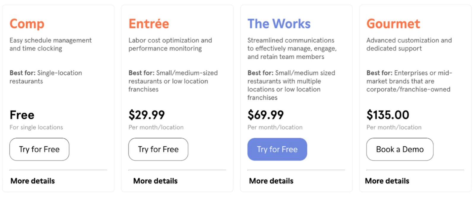 Looking at 7shifts pricing page, users may experience a cognitive overload when deciding which specific plan is best for their particular needs.