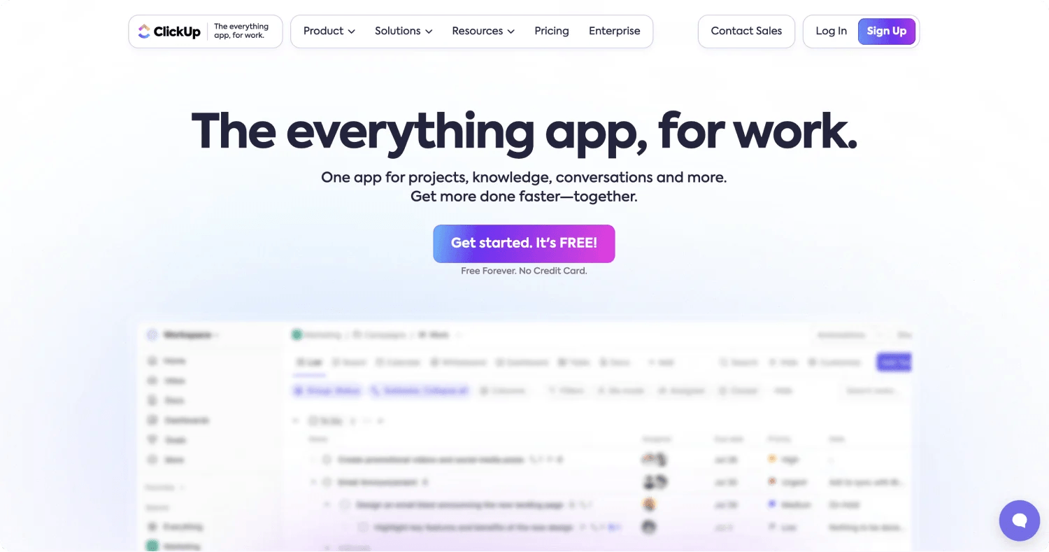 ClickUp’s homepage incorporates drag-and-drop functionality, allowing users to interact with the product directly from the website. It immediately highlights its core message as “The everything app for work,” combining sleek visuals with compelling CTAs like “Get Started. It’s FREE.”