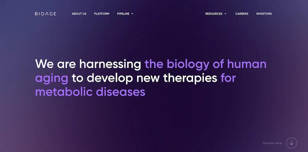 BioAge Labs’ homepage combines simplicity and sophistication with a purple background accented by similar shaded elements to reflect its focus on aging and metabolic health.