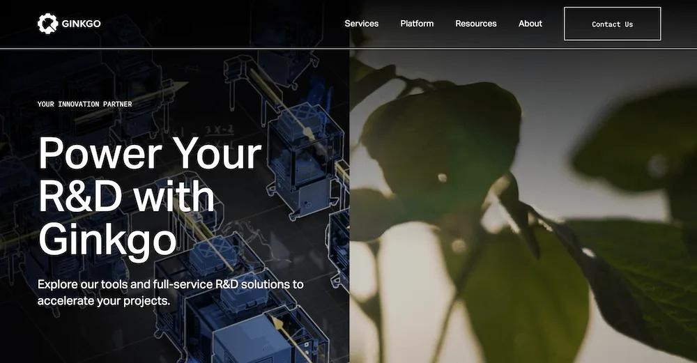 Ginkgo Bioworks’ homepage showcases a vibrant design with a white background enhanced by black accents, reflecting its focus on biotechnology and innovation. The layout is modular, with clear sections for R&D tools, solutions, and industries served.