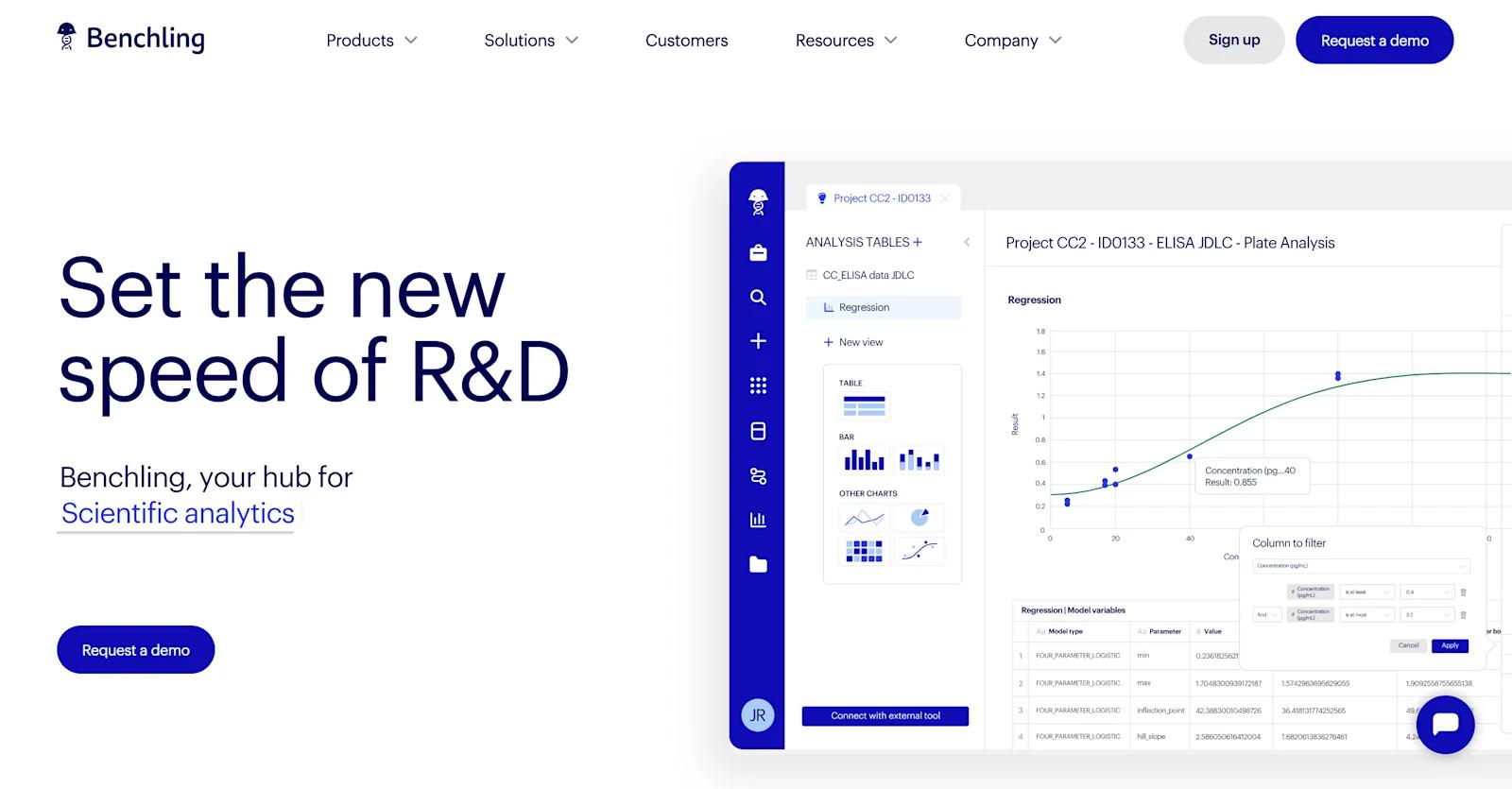 Benchling’s homepage has a polished and futuristic design with a clean white and blue color scheme, reflecting its focus on innovation and biotech. The layout features a balance of text and visuals, including icons and diagrams that simplify complex ideas.