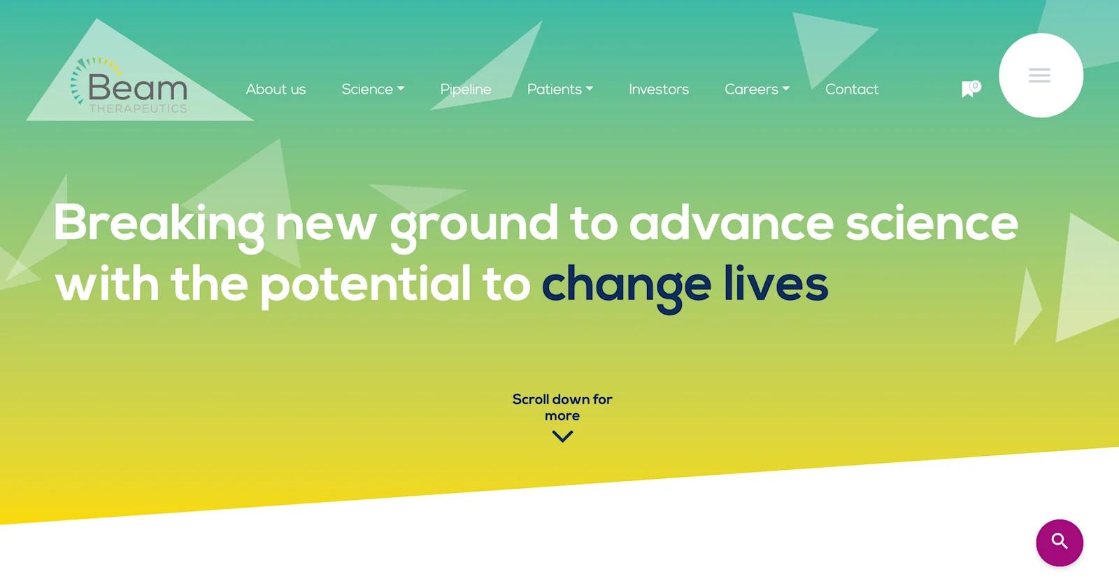 Beam Therapeutics’ homepage employs a sleek, modern design with a white and teal color scheme, emphasizing innovation and cutting-edge science. The site highlights its mission to revolutionize genetic medicine through base editing with bold headers and immersive imagery.