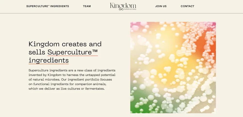 Kingdom Supercultures’ homepage is vibrant and approachable, combining a white background with bold orange and blue accents that reflect innovation in food science. The design features large visuals and streamlined sections explaining their Superculture™ ingredients and processes.