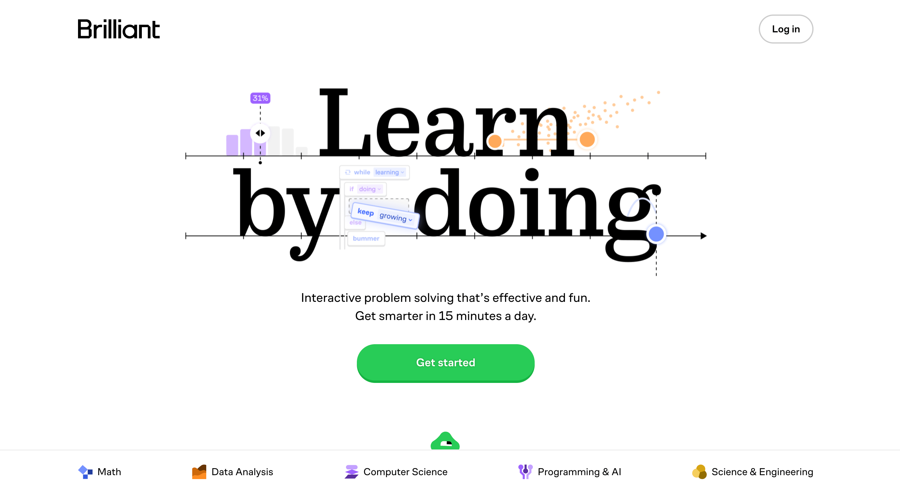 Brilliant’s homepage features an engaging and modern design with a white background and vibrant accents of blue and green that highlight key features.