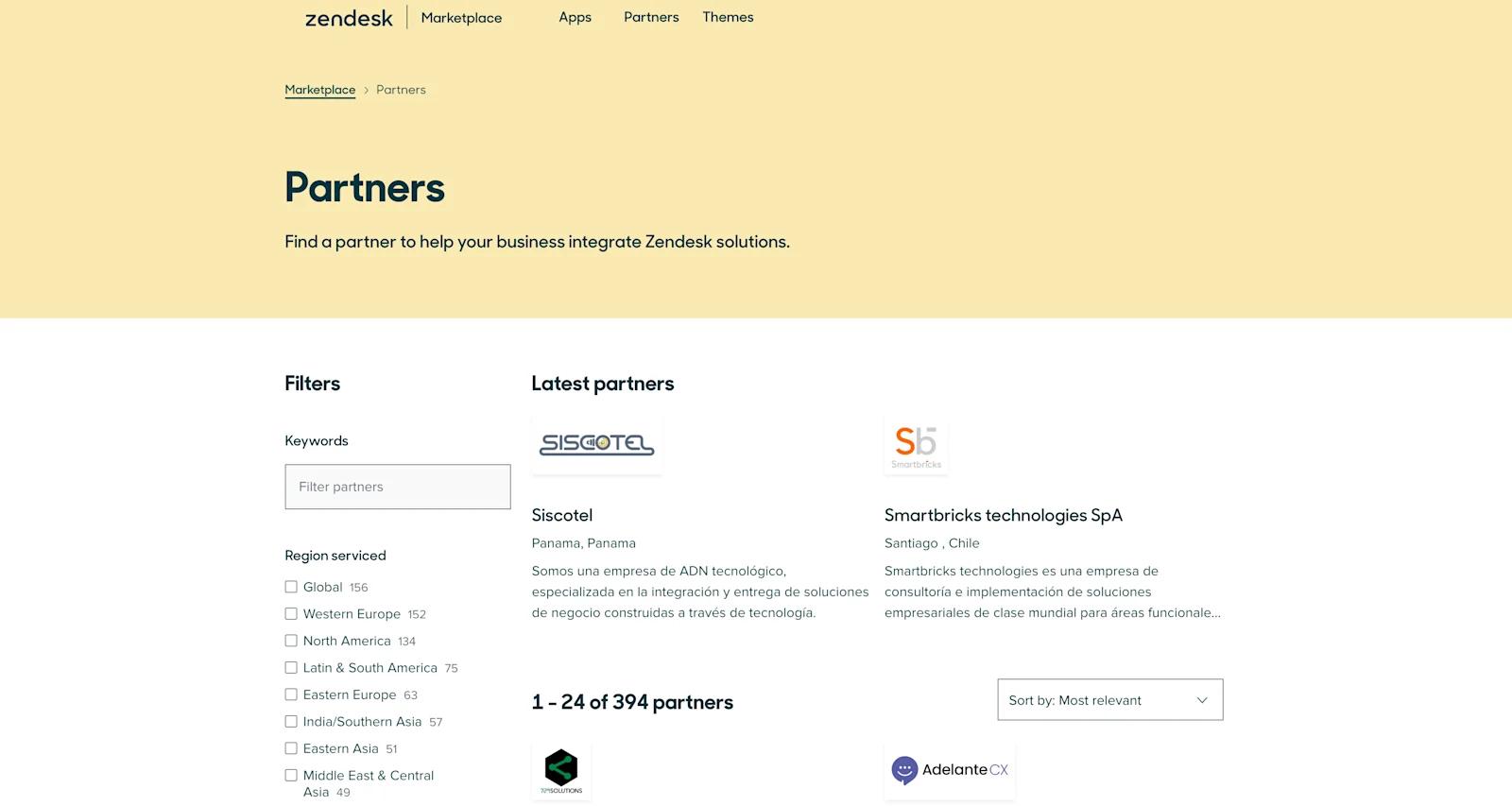 Zendesk's marketplace helps its customers enhance their customer service and support workflows, providing a seamless experience for both businesses and their clients. Partner profile pages include the services they offer, the regions they operate in, and the types of Zendesk partners they are. They also include things like accreditations, apps/themes they’ve built and customer reviews.