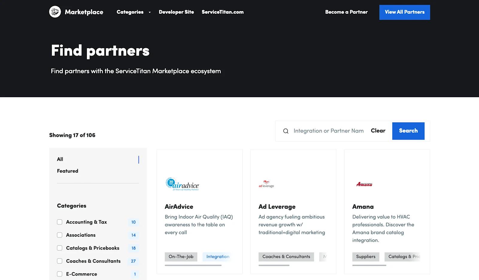 ServiceTitan's marketplace offers a diverse ecosystem of partners to enhance the overall experience for home service professionals. From a design perspective, it has filters and search functionality that make navigating the marketplace very simple.