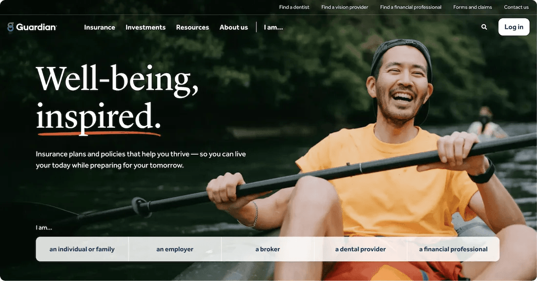Guardian Life's homepage emphasizes professionalism and accessibility through a clean, structured design. A soothing blue and white color palette reinforces trust and calmness, complemented by sharp typography that enhances readability. The site’s modular layout organizes information into digestible sections, ensuring users can navigate effortlessly. You get to choose your profession and insurance type using the interactive elements. You can also get a quote using the coverage calculators and resources.