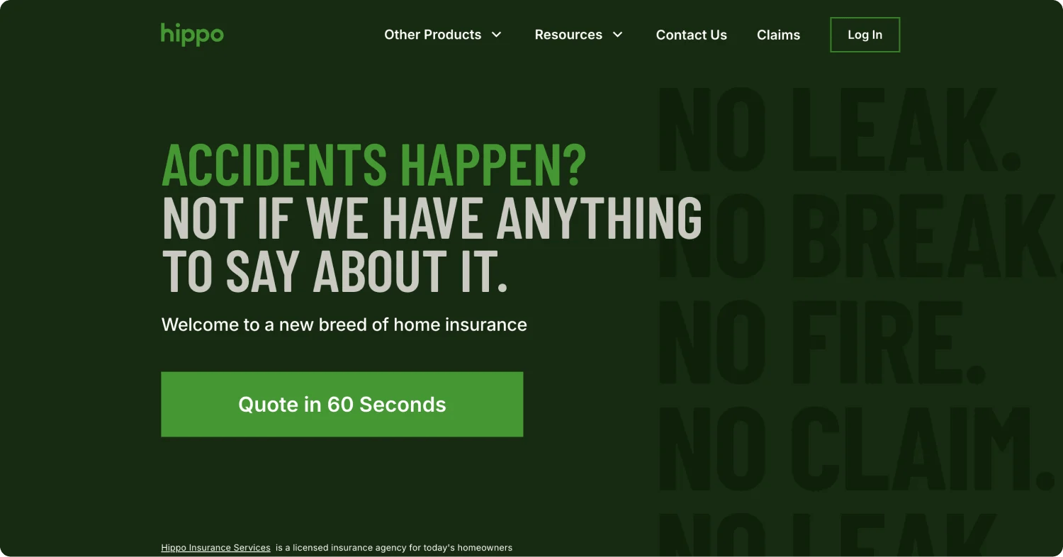 Hippo’s website emphasizes speed with copy like “Quote in 60 seconds.”