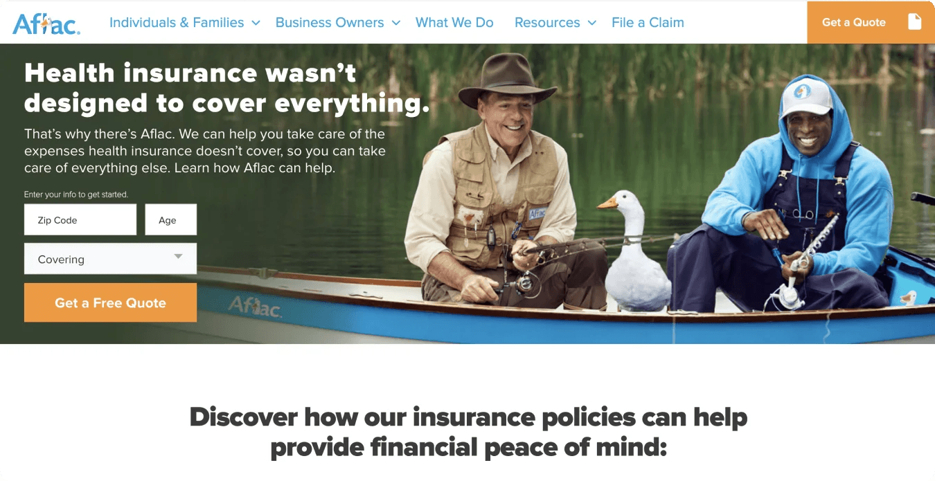 Aflac's website adopts a clean and professional design with a primarily blue and white color scheme, symbolizing trust and reliability. Colored accents are strategically used to highlight call-to-action buttons like "Get a Quote" and "Find a Plan," ensuring key features stand out.