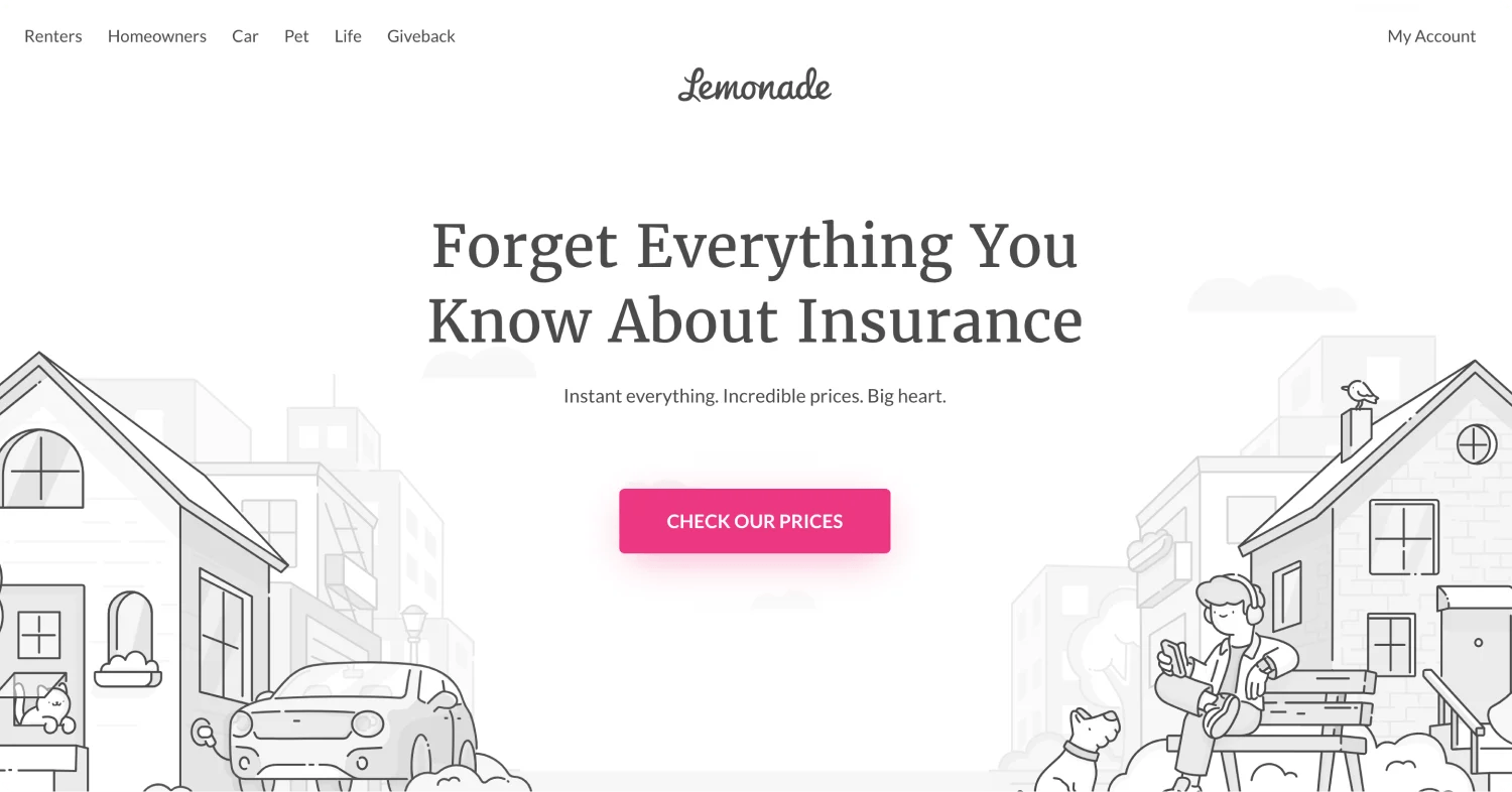 Lemonade’s website is a standout example of minimalist, user-driven design. The homepage greets users with a conversational chatbot ‘Maya’ with the CTA “Check Our Prices.” Their color palette—bright pink accents against clean white backgrounds—enhances brand recognition. Animated visuals and playful copy make the site engaging without feeling overwhelming. The trust-building approach includes transparency on pricing and claims handling.