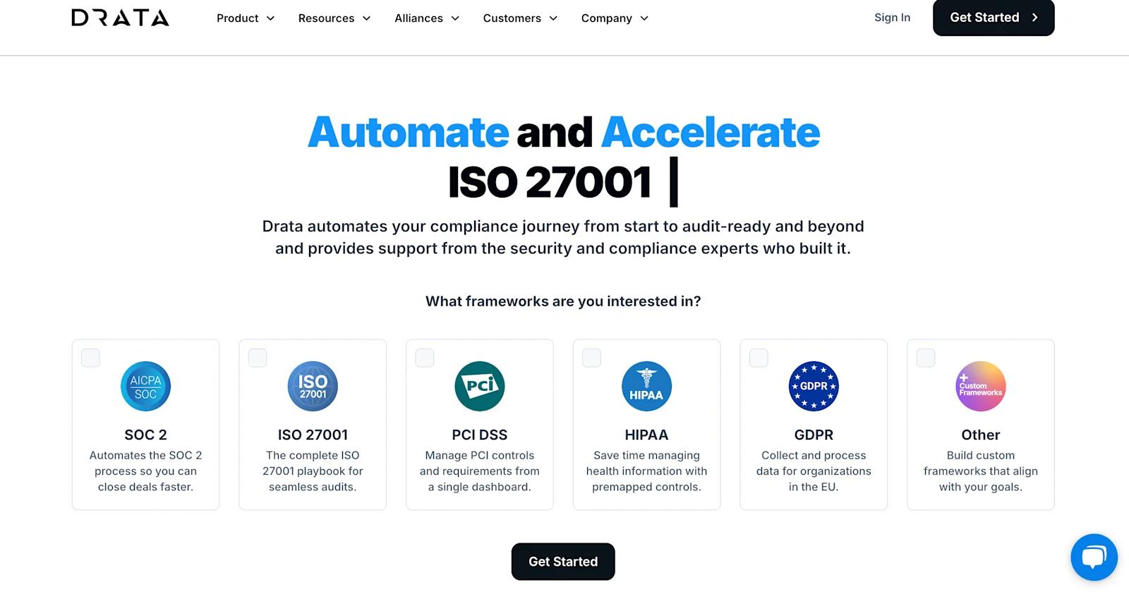 Drata is a platform that automates compliance monitoring and supports real-time auditing of security controls. It integrates with your existing tech stack and allows organizations to maintain continuous compliance with standards like SOC 2 and ISO 27001.