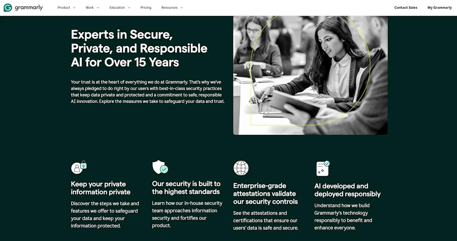 - 🤖 Dedicated section on Responsible AI – Grammarly proactively addresses AI risks, showcasing how it builds AI models responsibly to protect user data and avoid bias.