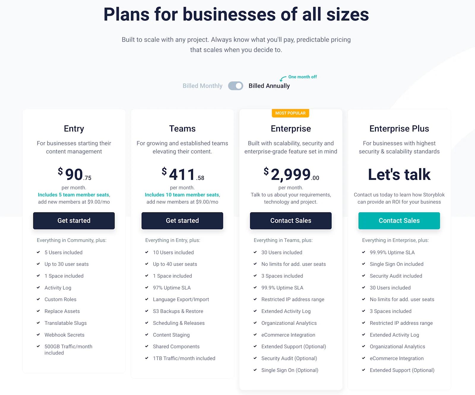 Storyblok has 4 pricing editions, from $0 to $2,999. A free trial of Storyblok is also available. Following are different pricing tiers one can select according to the features that meet his budget and needs.