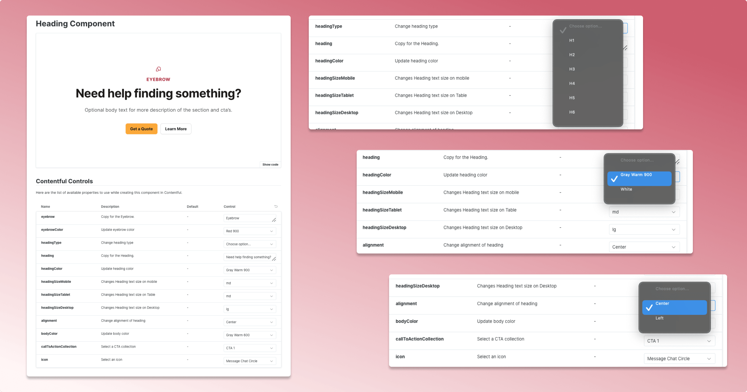 Any user can go in and alter the component with any variations it is developed with. In this instance, a content editor or developer can play with controls such as the heading type, heading color, and alignment. All these changes can be observed in real-time, in isolation, in Storybook.